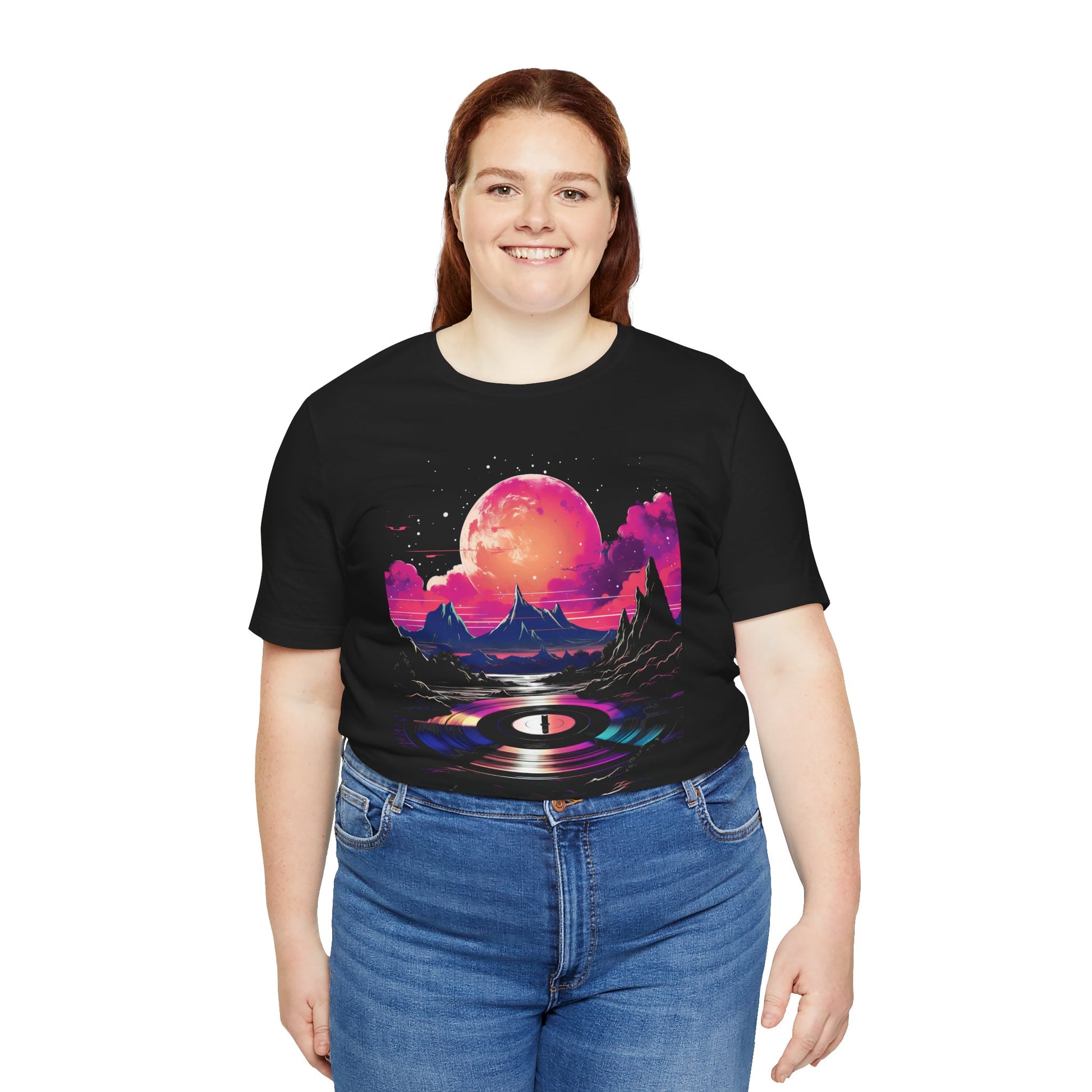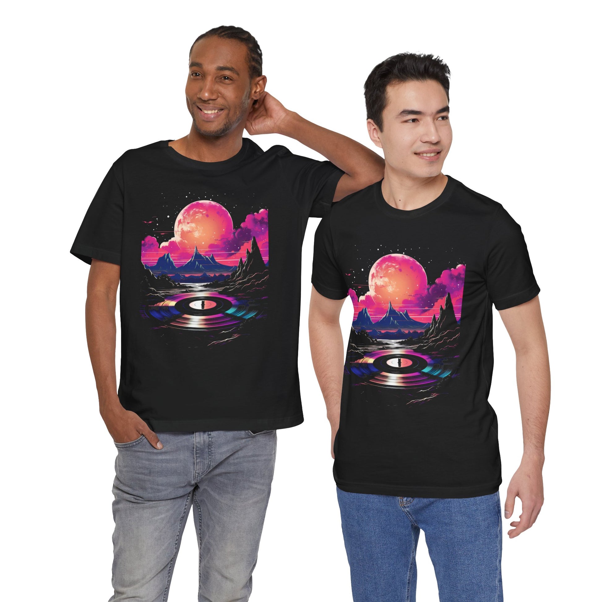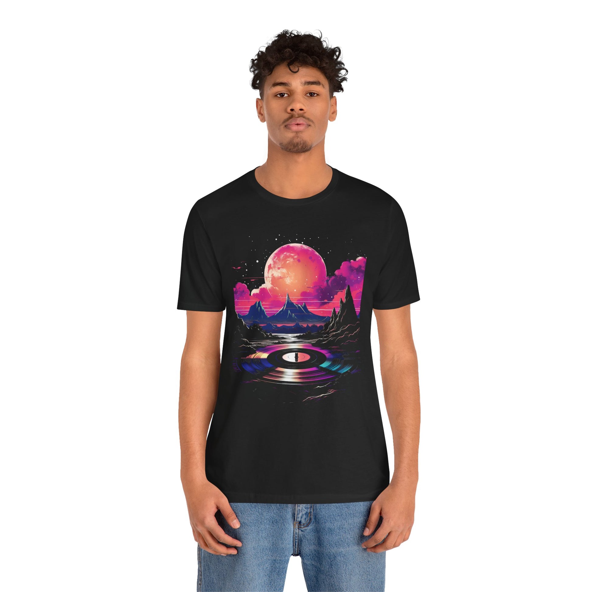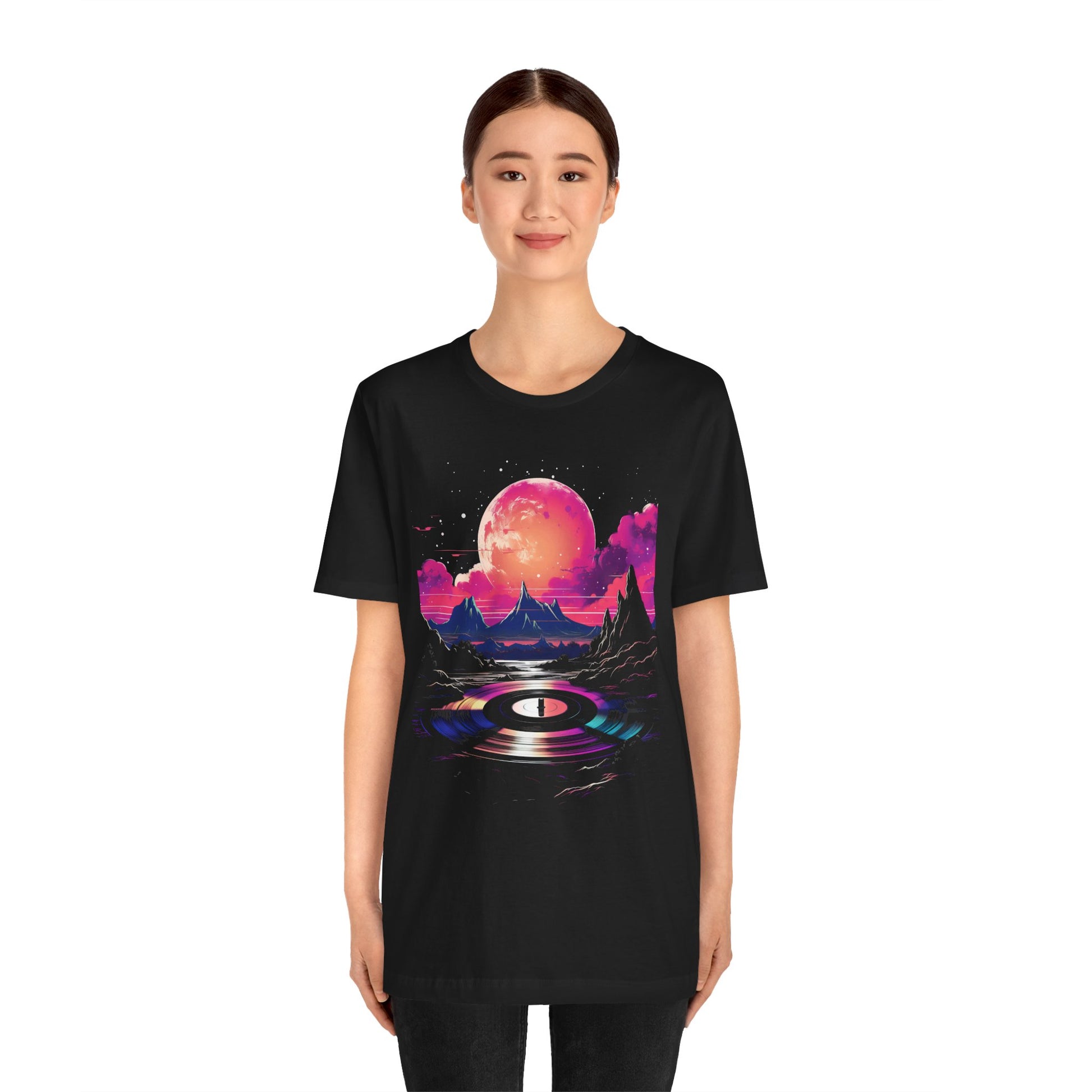 This tee encapsulates the essence of the 80s and 90s, featuring a meticulously detailed vinyl record at its center, adorned with vibrant splashes of color reminiscent of neon signs reflecting off city streets.